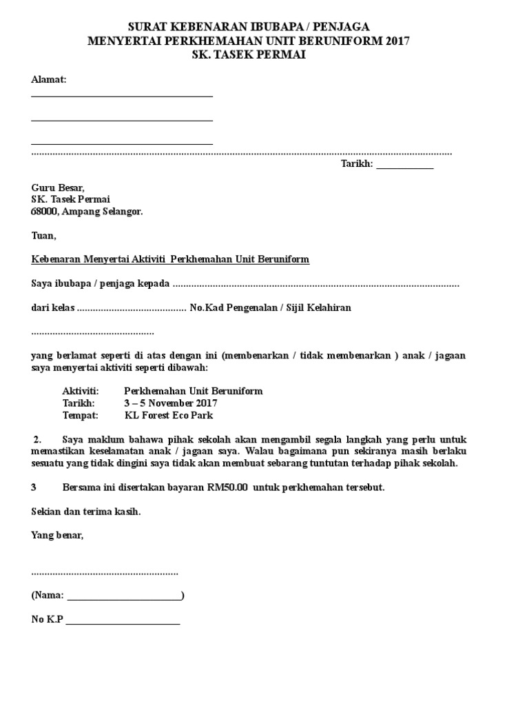 Surat Kebenaran Ibubapa Untuk Perkhemahan Pdf